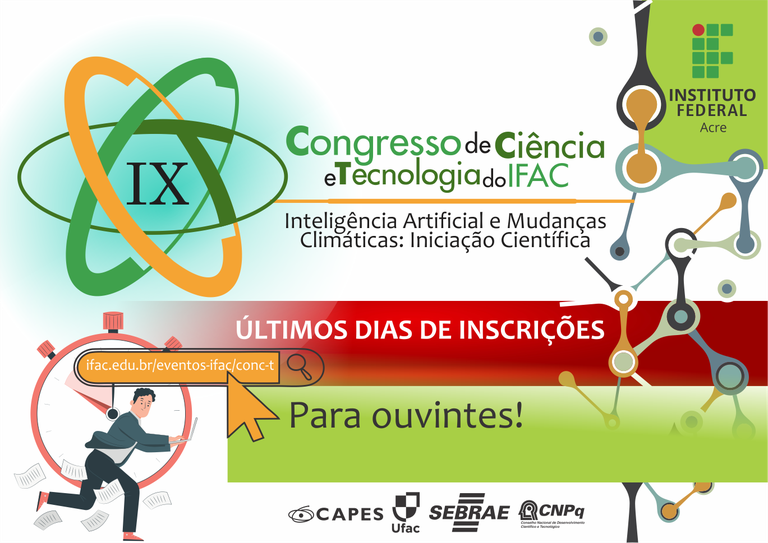 As inscrições para ouvintes do Congresso de Ciência e Tecnologia do Instituto Federal do Acre - Conc&T/Ifac continuam abertas até quarta-feira, dia 19.06. O evento acontecerá de forma virtual entre os dias 25 e 27 de junho. Com o tema "Inteligência Artificial e Mudanças Climáticas: Soluções Inclusivas para um Planeta em Transformação", o evento reunirá estudantes, pesquisadores e convidados para o debate sobre desafios e soluções sustentáveis para a região amazônica por meio da ciência.