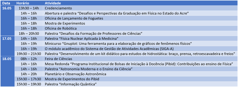 Além da apresentação dos projetos de pesquisa e extensão, também serão realizadas palestras, mostra de experimentos, mesas redondas, minicursos, oficinas e ainda a exposição do Planetário do Ifac.