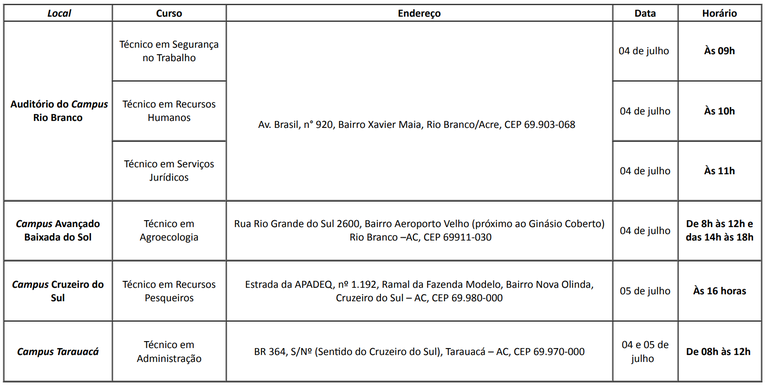 Conforme edital, os candidatos classificados durante a reunião pública deverão efetivar a matrícula nos cursos técnicos entre os dias 08 a 10 de julho, no setor de Registro Escolar dos campi do Ifac.