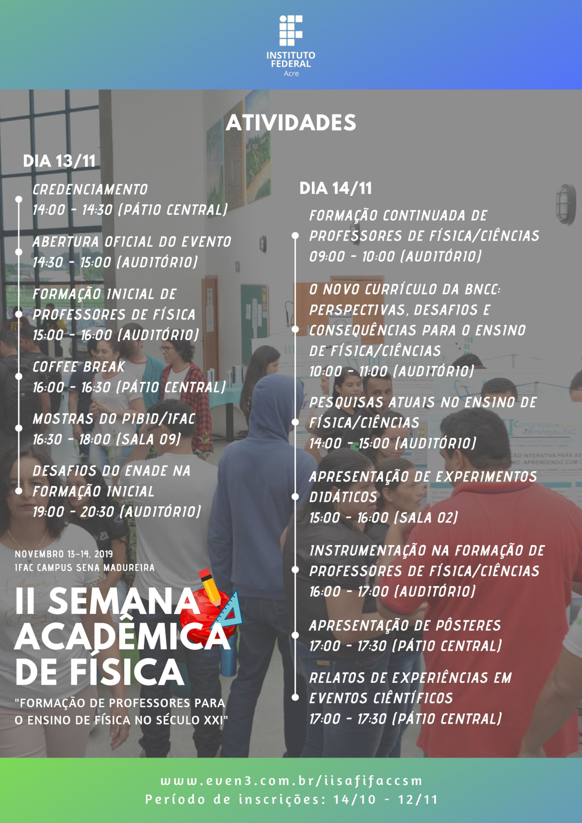 O Instituto Federal do Acre (Ifac) campus Sena Madureira está com inscrições abertas para a II Semana Acadêmica de Física, que será realizada nos dias 13 e 14 de novembro. O evento é destinado a estudantes de ensino médio, de ensino superior na área de física e licenciaturas em geral, professores e comunidade. As inscrições podem ser realizadas no site even3.com.br/iisafifaccsm até dia 12 de novembro.