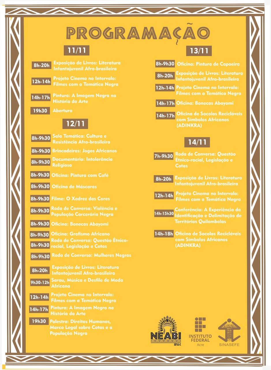 “A proposta é discutirmos aspectos da arte afro-brasileira com oficinas de confecção de bonecas, máscaras, pintura em café, grafismo africano, Capoeira e muitas outras. Também teremos atividades sobre racismo e música, painéis sobre resistência afro-brasileira e exibição de documentários produzidos pelos alunos do Ifac e do Pibid da Ufac sobre preconceito, discriminação, intolerância religiosa e valorização das culturas negras na construção da sociedade brasileira”, explicou a coordenadora do Neabi do campus Rio Branco, Alcilene Alves que também destacou que este ano os próprios alunos também propuseram salas temáticas onde vão apresentar personalidades negras e elementos da culturas africanas.