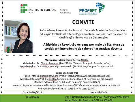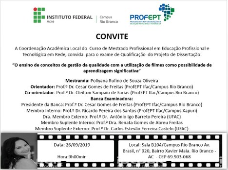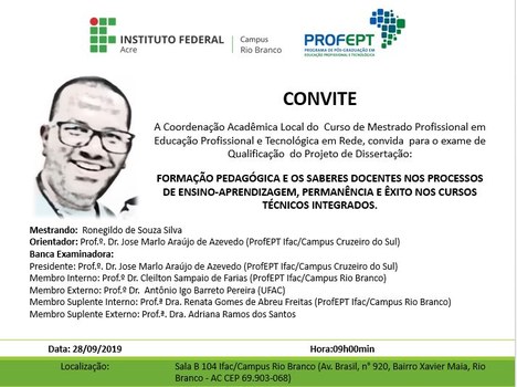 O Instituto Federal do Acre (Ifac), através da Coordenação Acadêmica Local, convida a comunidade para prestigiar os exames de qualificação dos mestrandos Jefferson Teixeira Sarmento de Lima (20 de setembro), Maria Lionilde Araújo da Silva (25 de setembro), Pollyana Rufino de Souza Oliveira (26 de setembro) e Maria Cecília Pereira Ugalde (04 de outubro), da Turma 2018 do curso de Mestrado Profissional em Educação Profissional e Tecnológica, ProfEPT. As atividades serão realizadas no auditório do campus Rio Branco.