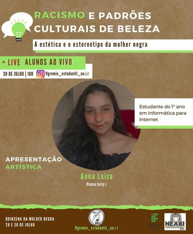 O Núcleo de Estudos Afro-Brasileiro e Indígena (Neabi) juntamente com o Grêmio Estudantil Un.i.r do campus Rio Branco convidam para as atividades online da Quinzena da Mulher Negra. O evento será nos dias 29 e 30 de julho, pela plataforma Google Meet e pelo Instagram. A participação na atividade pode ser feita pelo link https://www.even3.com.br/racismoepadroesebeleza/