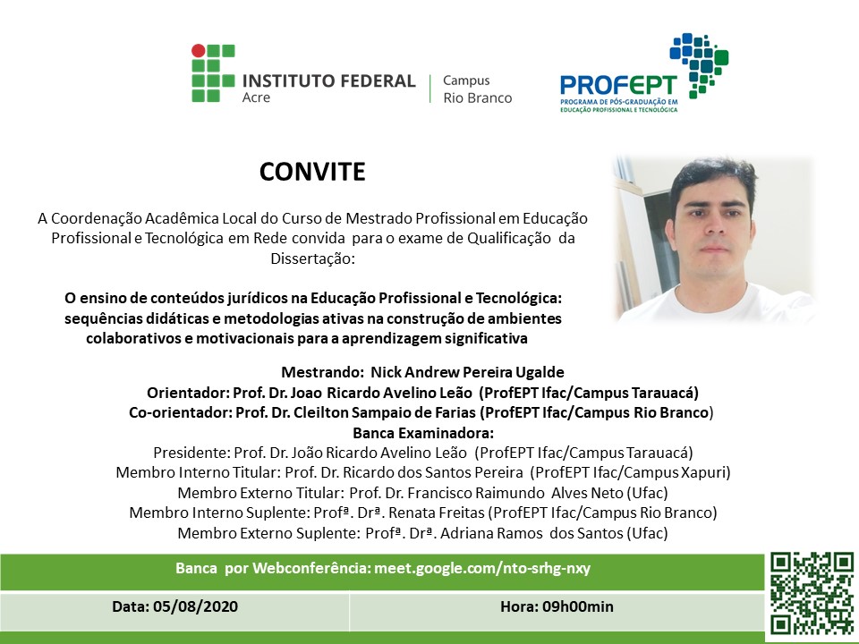 O Instituto Federal do Acre (Ifac), através da Coordenação Acadêmica Local, convida a comunidade para prestigiar o exame de qualificação do mestrando Nick Andrew Pereira Ugalde agendado para o dia 05 de agosto.