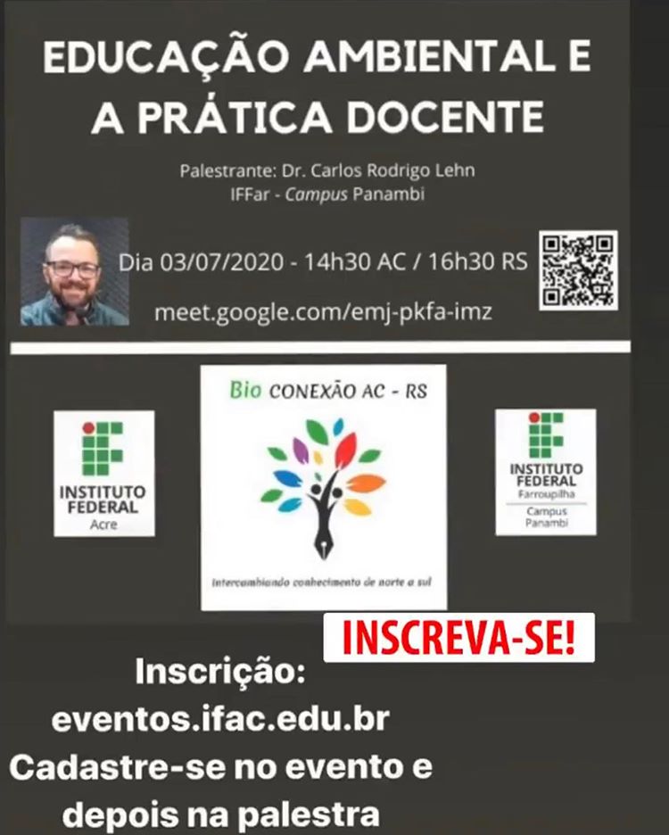 O Instituto Federal do Acre (Ifac) e o Instituto Federal de Farroupilha (IFFar) estão realizando o evento “Bio Conexão AC - RS” que vai contar com diversas atividades on-line ao longo de 2020. O projeto terá início na sexta-feira (3.07) com a palestra “Educação Ambiental e a Prática Docente”, que será ministrada pelo professor Dr. Carlos Rodrigo Lehn. O evento ocorrerá pelo Google Meet, às 14h30 (horário local), e a inscrição pode ser feita pela plataforma Cachalote Ifac, em eventos.ifac.edu.br.