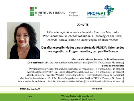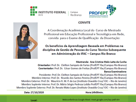 O Instituto Federal do Acre (Ifac), através da Coordenação Acadêmica Local do Programa de Pós-Graduação em Educação Profissional e Tecnológica (ProfEPT), convida a comunidade para prestigiar os exames de qualificação das mestrandas Ana Cristina Melo Leite da Cunha, Irismar Severino da Silva Fernandes e Priscila da Silva Soares.