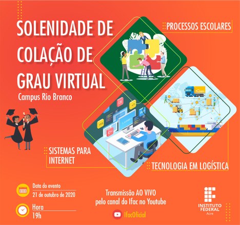 No dia 21 de outubro, o Ifac realiza a colação de grau dos cursos superiores de Tecnologia em Logística, Processos Escolares e Sistemas para Internet, do campus Rio Branco. A atividade, que terá início às 19h, também será transmitida pelo canal do Ifac no YouTube.
