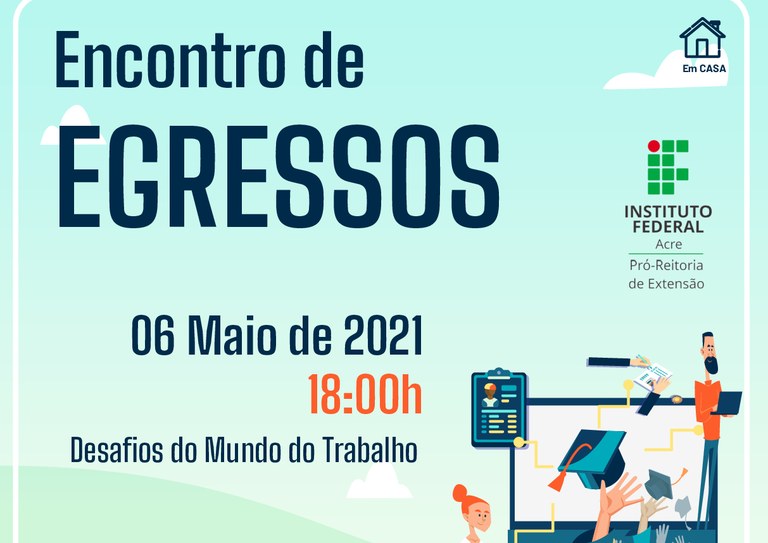 O Instituto Federal do Acre (Ifac), por meio da Pró-Reitoria de Extensão (Proex), realizará no dia 6 de maio, às 18h, o Encontro de Egressos com o tema “Desafios do Mundo do Trabalho”. O evento será transmitido ao vivo pelo canal do Ifac no YouTube. As inscrições podem ser feitas pelo link: https://eventos.ifac.edu.br/evento/encontro-de-egressos