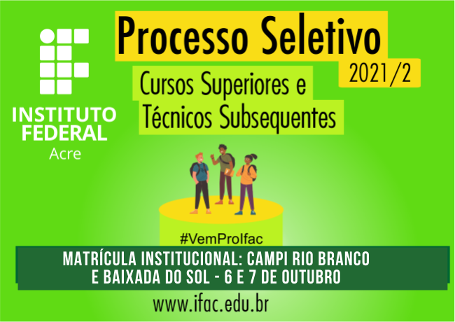 O Instituto Federal do Acre (Ifac) publicou o resultado da manifestação de interesse nas vagas remanescentes do Processo Seletivo 2021/2 de cursos técnicos subsequentes e superiores. Anexos aos editais, foram publicadas as listas com os candidatos classificados e a convocação para a matrícula institucional que ocorrerá nos dias 6 e 7 de outubro nos campi, nos horários especificados nos editais.