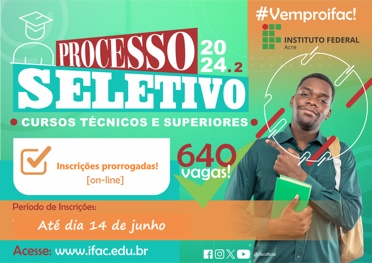 O Instituto Federal do Acre (Ifac) prorrogou as inscrições para o Processo Seletivo 2024/2, para os cursos Técnicos Subsequentes ao Ensino Médio e Graduação, através do edital complementar nº 01, de 16 de maio de 2024.
