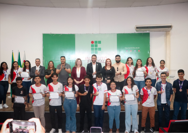 Na manhã desta quinta-feira, 05.06.2025, no Campus Sena Madureira, ocorreu a cerimônia de entrega das medalhas da seletiva estadual da Olimpíada Brasileira de Química - OBQ 2024. A premiação, que contou com a participação do Reitor Fábio Storch e da Deputada Federal Socorro Nery, contemplou 19 alunos do referido campus, com medalhas de ouro, prata, bronze e menções honrosas, em que o campus foi um dos destaques de todo o estado.