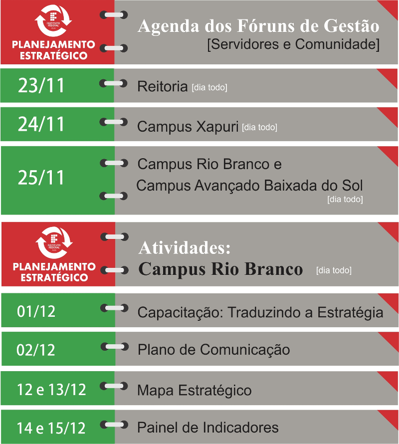 Além da agenda de fóruns, também foram definidas as atividades de capacitação “Traduzindo a Estratégia” (01/12/2016); Plano de Comunicação (02/12/2016); Mapa Estratégico (12 e 13/12/2016); e Painel de Indicadores (14 e 15/12/2016).