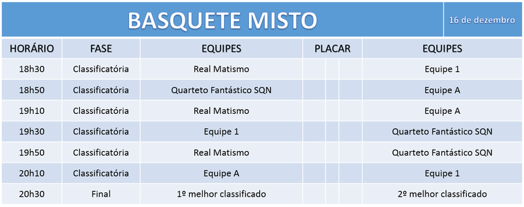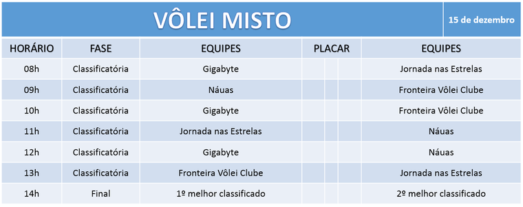 Conforme a programação, no dia 15 de dezembro, a partir das 08h, no campus Rio Branco serão iniciadas as partidas de vôlei. No mesmo dia, a partir das 14h, será a vez dos atletas de tênis de mesa. No dia 16 de dezembro, a partir das 18h30, as equipes de basquete misto entram em quadra, na Escola Estadual Heloisa Mourão Marques. Para encerrar o evento, no dia 17 de dezembro, serão realizados os jogos dos times masculinos de futsal.