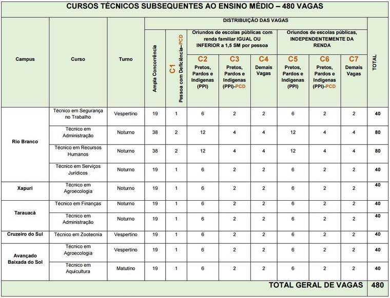 Conforme edital, poderão participar desta edição somente pessoas que já tenham concluído o Ensino Médio. As vagas disponíveis são para os cursos técnicos em Administração, Agroecologia, Aquicultura, Finanças, Recursos Humanos, Segurança do Trabalho, Serviços Jurídicos e Zootecnia. Das 480 vagas, 252 vagas são destinadas às ações afirmativas e cotas sociais, respeitando as legislações nacionais.