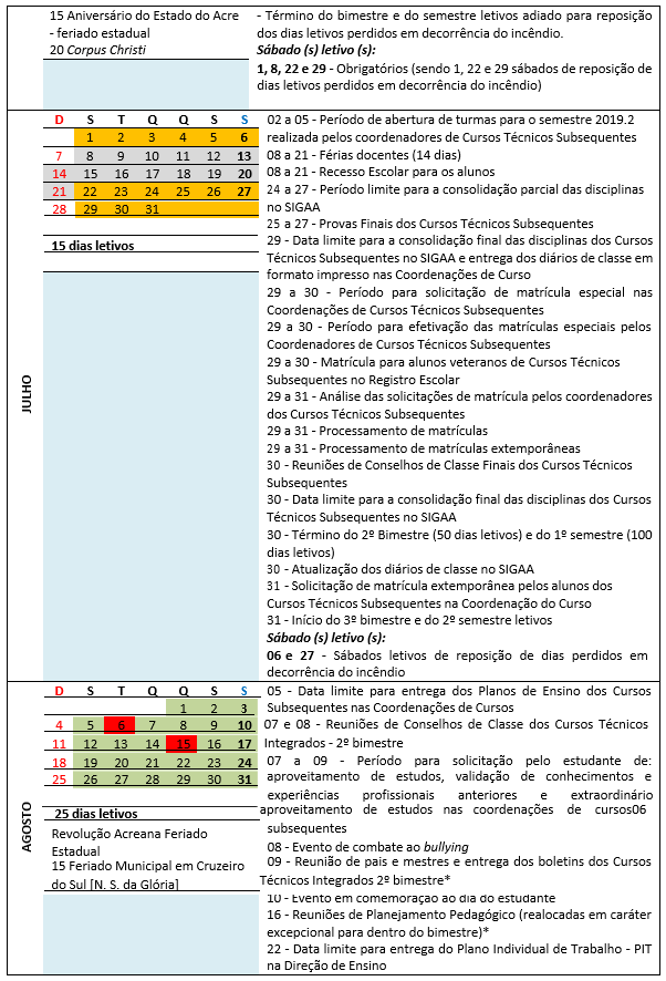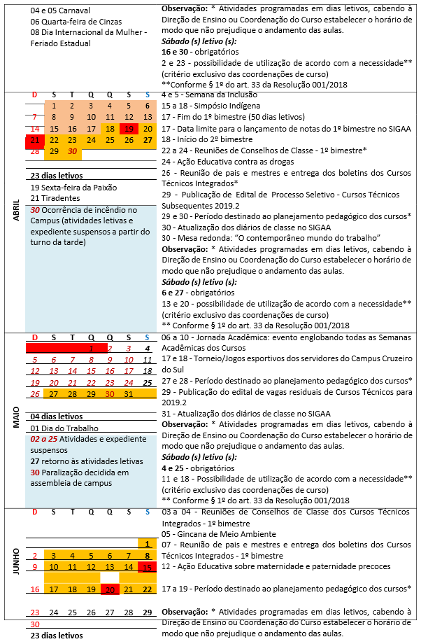 Dispõe sobre a aprovação dos ajustes do Calendário Letivo para o ano letivo 2019 dos Cursos Técnicos, com ajustes após o incêndio, proposto pelo Campus Cruzeiro do Sul. |