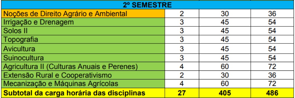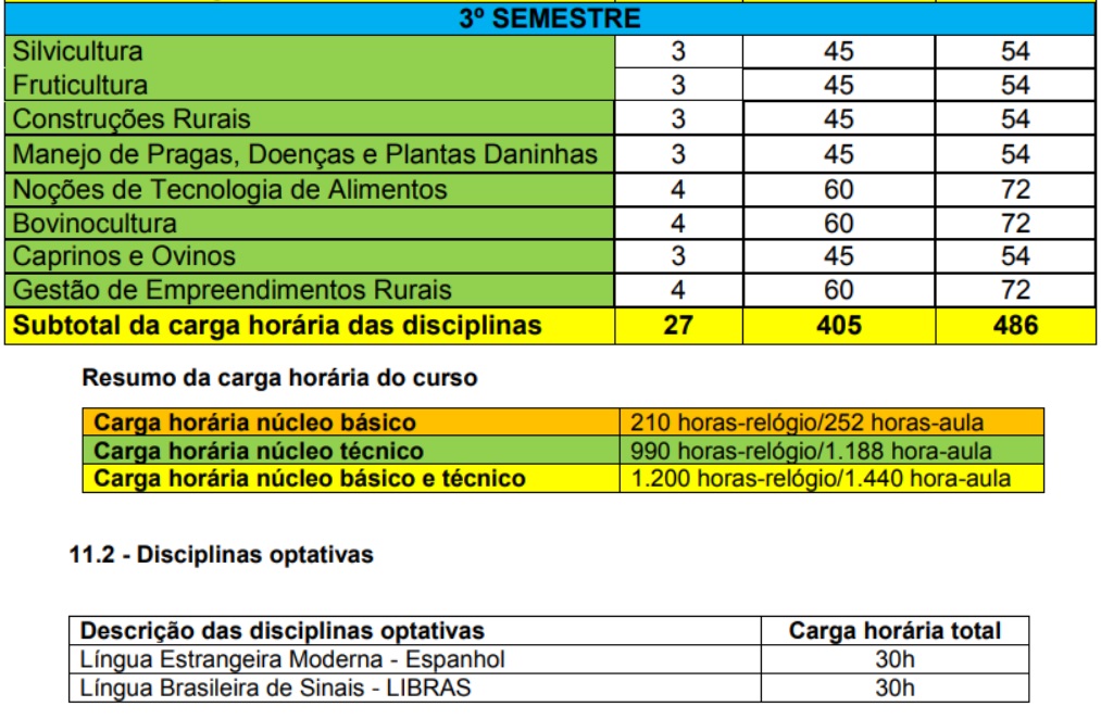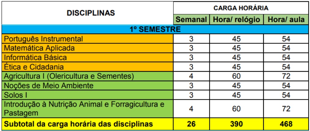 MATRIZ CURRICULAR DO CURSO TÉCNICO SUBSEQUENTE AO ENSINO MÉDIO EM AGROPECUÁRIA